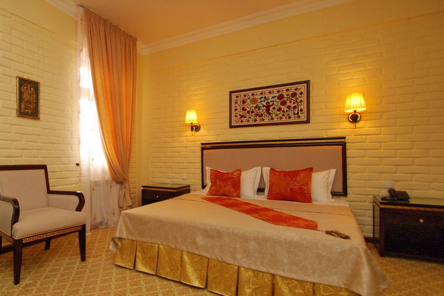 La chambre convient pour le logement de 1 ou de 2 personnes. Dans chaque chambre il y a la salle de bains avec la douche. Ici vous trouverez tout le nécessaire. La salle à coucher est décorée en style européen. Les murs sont ornés par des tableaux des peintres ouzbeks. La chambre est équipée du climatiseur, du téléphone, de la télévision directe par satellite, du minibar et de beaux meubles. Le prix de la chambre comprend la visite de la salle de musculation, de la piscine et le petit déjeuner.