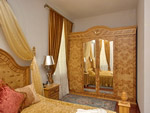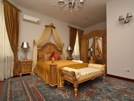 C’est une chambre de luxe avec un grand lit. La décoration de la chambre est faite en style des appartements de roi. La chambre a tout le nécessaire pour le repos confortable. La salle de bain est équipée de la cabine de douche.