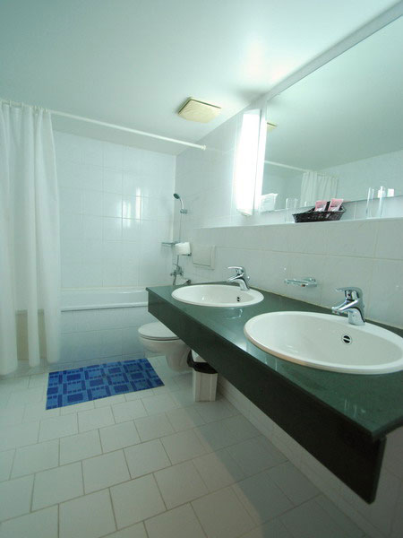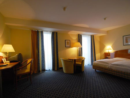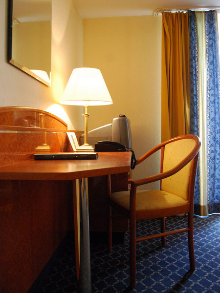 C'est une chambre vaste à une chambre avec un large lit, où il y a la table avec la torchère, le bureau et l'armoire avec le mini-bar encastré.