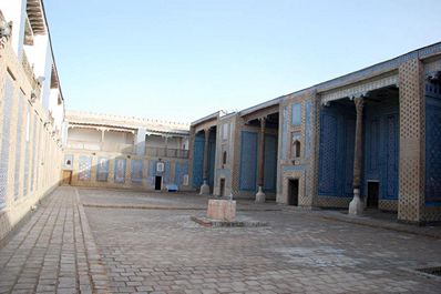 メインファサードの近くには、南向きに屋根付きのバザール(ティム)が建てられ、現在はティムとキャラバンサライが一体のエリアを形成しています。屋根付きバザールは、東西に広がる複数のキューポラ(小ドーム)で構成され、中央にはキャラバンサライに通じるホールがあります。商取引は横に並んだ屋台で行われ、数世紀前には中国、イギリス、ブハラ・ハン国から運ばれた品物がここで取引されていました。