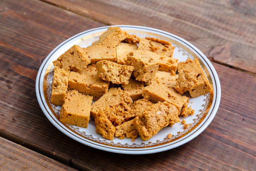 Unlike kurt balls, which are eaten all throughout Central Asia, irimshik is only found in Kazakhstan. Irimshik is a curd that tastes slightly sweet yet contains no added sugar. It takes patience to cook irimshik: The milk must be brought to a boil over low heat, and after cooling slightly a sourdough is mixed in and left to sit for a couple of hours. The milk is then boiled over low heat a second time. Once it has curdled, the whey is separated and the curd is placed in a bag to let the excess liquid drain.