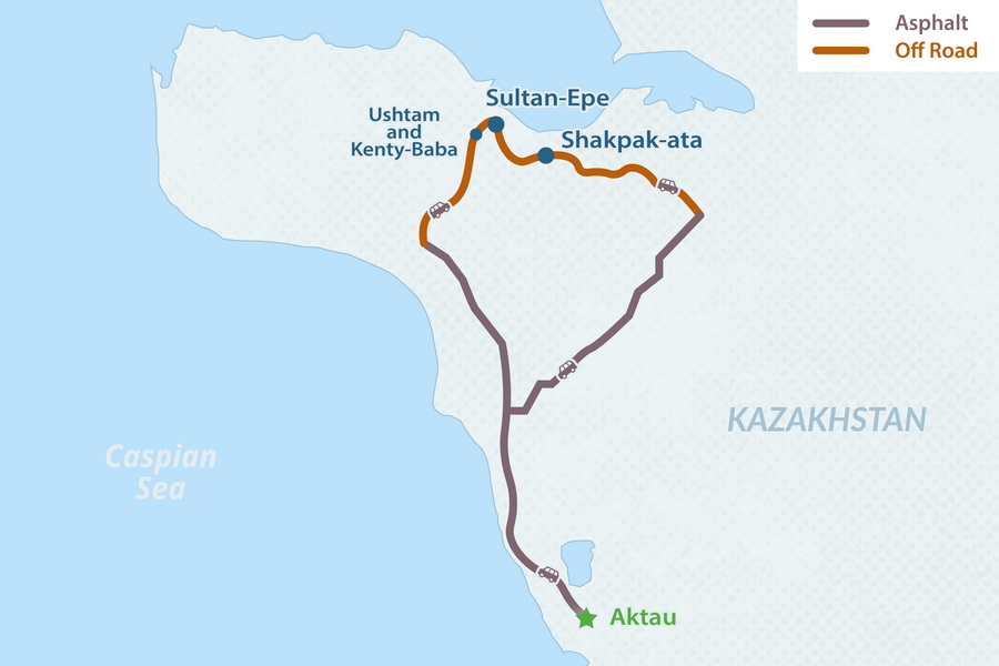 16:00 – 18:00 Return to Aktau – beginning with 35 km of dirt road, which gradually transitions to asphalt, followed by another 100 km on a well-maintained highway. Arrival in Aktau. End of the one-day tour to the underground mosques of Sultan-Epe and Shakpak-ata.