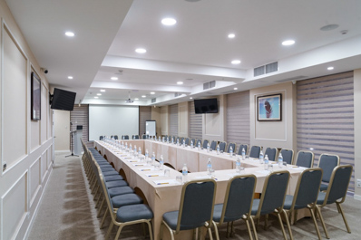 The conference hall is equipped with everything needed, from a projector and laptop to markers and water. Seating can be rearranged to fit your needs, and can accommodate from 30 to 50 people.
