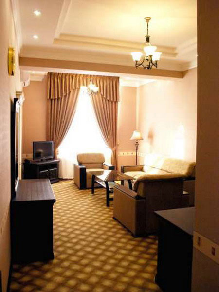 Роскошный номер для взыскательных клиентов. Интерьер номеров класса «люкс» выдержан в классическом стиле: роскошные шторы на окнах в изысканной драпировке, красивая мебель, включая мягкие и удобные диваны, кресла и журнальный столик. Номер оборудован большой и удобной двуспальной кроватью. Также в комнате есть телевизор, холодильник и спутниковое телевидение. Ванная комната оснащена современным джакузи и биде.