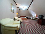 Большой и светлый номер повышенной комфортности находится на последнем этаже гостиницы. Это - комната мансардного типа с асимметричными потолками, придающими ей особую оригинальность. В номере есть все необходимое для комфортного проживания: широкая двуспальная кровать, мягкая мебель, рабочая зона с письменным столом, просторная ванная комната.
