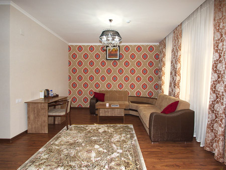 The most luxurious option at the Bek Hotel are the apartments. Each apartment is a spacious room, visually divided up into a sleeping area and sitting area. There is a large double bed, comfortable furniture, a writing table, television, and everything else for a comfortable stay. The bright bathroom comes with a shower cabinet.