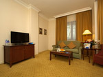 The room is spacious and cozy. Warm colours of the interior are perfect for relaxation. One can enjoy watching favorite TV programs on a small sofa. The room has a writing desk and a coffee table. There is everything one needs for a comfortable stay. There is a full-size bathtub in the bathroom. King-size soft bed will guarantee your nice sleep.